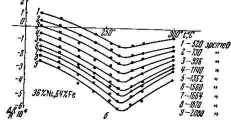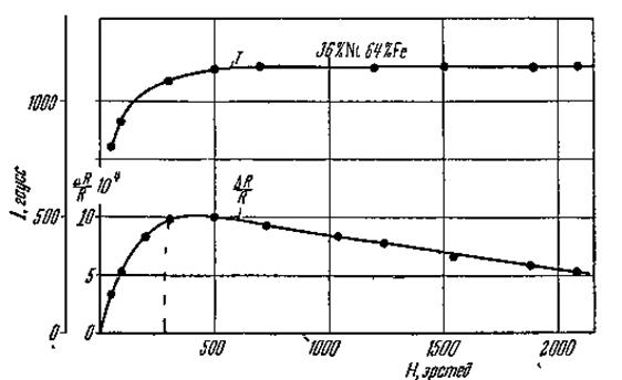 6. Наименьшее значение полного магнетосопротивления приходится на инварные сплавы, причем имеет место увеличение полного магнетосопротивления, как в сторону высоких концентраций никеля, так и в сторону более низкой концентрации никеля (инварной области).