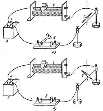 В 1820 г. датский физик Эрстед обнаружил магнитное действие тока. Это явление заключается в том, что магнитная стрелка, помещенная вблизи проводника с током, отклоняется от плоскости магнитного меридиана и уже, как правило, не указывает с севера на юг.