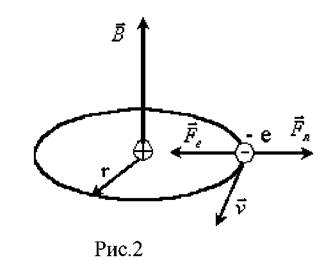 Если вещество находится во внешнем магнитном поле, то в пределах атома можно считать магнитное поле однородным. Это следует из малости линейных размеров атома. Предположим, что электрон в атоме движется по круговой орбите, плоскость которой перпендикулярна к вектору индукции B магнитного поля. Действие на электрон силы Лоренца FЛ приведет к уменьшению силы притяжения электрона к ядру. Центростремительная сила окажется равной разности Fe - F Л , где Fe - кулоновская сила притяжения электрона к ядру (рис. 2.). В результате изменится угловая скорость w движение электрона по круговой орбите. Она станет отличной от той, которую электрон имел в отсутствии внешнего магнитного поля.