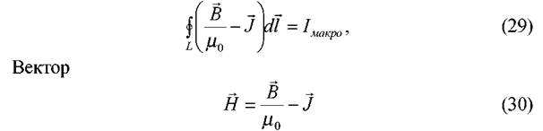 называется напряженностью магнитного поля, а из (29) следует, что циркуляция вектора напряженности магнитного поля вдоль произвольного замкнутого контура равна (или пропорциональна) алгебраической сумме макротоков сквозь поверхность, натянутую на этот контур.