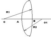 Рассмотрим тонкую линзу .то есть линзу у которой её толщина АВ много меньше радиусов R1 и R2 . Все последующие рассуждения относятся к тонкой линзе . Как сферические и плоские зеркала , линзы создают изображения источников света . Это означает ,что свет исходя из какой – либо точки предмета , после преломления в линзе снова собирается в одной точке( изображение),независимо от того, через какую часть линзы прошли лучи. В случае если прошедшие через линзу сходятся ,они образуют действительное изображение . Если прошедшие через линзу лучи расходятся, то пересекаются в одной точке не сами лучи , а их продолжения . изображение тогда является мнимым.