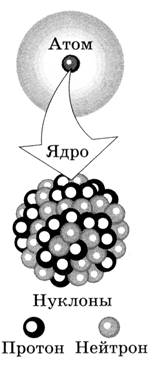 Атомное ядро любого химического элемента (кроме атома водорода) состоит из протонов и нейтронов (рис. 12.1). Эти частицы называются нуклонами.