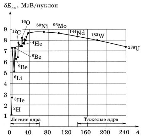 МэВ/нуклон. Это уменьшение обусловлено тем, что с возрастанием числа протонов в ядре увеличивается и энергия их кулоновского отталкивания.