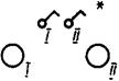 | в) проводка пересекает отметку, изобра-женную на плане, сверху вниз или снизу вверх и не имеет горизонтальных участков в пределах данного плана | ![]() |