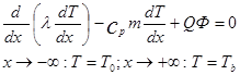 На границе зоны прогрева и горения (х = 0) в качестве граничного условия запишем уравнение теплового баланса между зонами прогрева и реакции