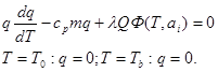 Здесь скорость реакции Ф , являющаяся согласно сделанному предположению функцией только температуры, должна обращаться в нуль при Т=Т b , поскольку температура горения Т b соответствует завершению реакции;Q – тепловой эффект реакции.
