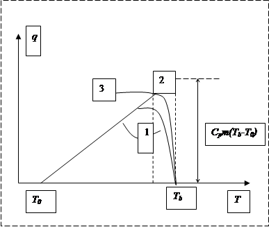 Таким образом, в координатах q - T (тепловой поток – температура) зоне прогрева соответствует прямолинейный участок кривой q ( T ) с углом наклона, пропорциональным скорости горения m . Решение (1.20) показано на рис. 2 прямой линией 2.