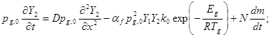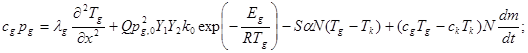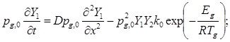 Здесь t – время; х - координата; Т - температура; ρ- плотность; с - удельная теплоемкость; Qpg ,0 –теплота химической реакции в газе, q – на поверхности частиц; Е – энергия активации химической реакции; k 0 , k 0, k - предэкспоненциальные множители в законе Аррениуса для гомогенной и гетерогенной реакций;m - масса частицы; N – число частиц в единице объема; λ, α, β m , D – коэффициенты теплопроводности, теплообмена, массообмена, диффузии; R - универсальная газовая постоянная; Y 1 , Y 2 - концентрации горючего и окислителя в газовой фазе; NuD - диффузионное число Нуссельта; af – стехиометрический коэффициент. Индексы: 1- горючий газ, 2- окислитель, in - инертная часть исходной газовой смеси и продукты горения, g - газовая фаза, k -дисперсная фаза, 0- начальные условия.