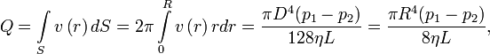 Согласно закону, секундный объёмный расход жидкости пропорционален перепаду давления на единицу длины трубки (градиенту давления в трубе) и четвёртой степени радиуса (диаметра) трубы:
