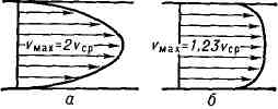 Профиль осреднённой скорости: а - при ламинарном, 6 - при турбулентном течении.