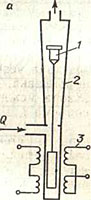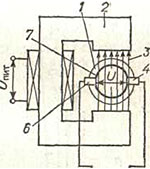 Действие электромагнитных расходомеров основано на законе электромагнитной индукции, согласно которому в проводнике, движущемся в магнитном поле, будет наводиться э. д. с, пропорциональная скорости движения проводника. В электромагнитных расходомерах роль проводника выполняет электропроводная жидкость, протекающая по трубопроводу 1 и пересекающая магнитное поле 3 электромагнита 2. При этом в жидкости будет наводиться э. д. с. U, пропорциональная скорости ее движения, т. е. расходу жидкости.