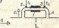 Тепловой расходомер состоит из нагревателя 1 и двух датчиков температуры 2 и 3, которые устанавливаются снаружи трубки 4 с измеряемым потоком. При постоянной мощности нагревателя количество тепла, забираемое от него потоком, будет также постоянным. Поэтому с увеличением расхода Q нагрев потока будет уменьшаться, что определяется по разности температур, измеряемой термодатчиками 3 и 2. Для измерения больших расходов измеряют не весь поток Q, а лишь его часть Q1, которую пропускают по трубке 4. Эта трубка шунтирует участок трубопровода 5, снабженный дросселем 6. Проходное сечение дросселя определяет верхнюю границу диапазона измеряемых расходов: чем больше это сечение, тем большие расходы можно измерять (при той же мощности нагревателя).