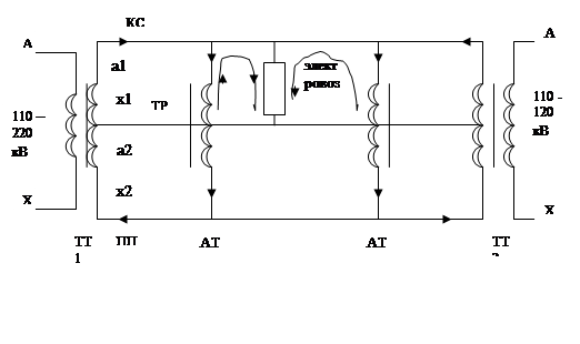 АТ подключают к КС и ПП через разъединители. Средний вывод АТ присоединяют к средней точке дроссель – трансформатора. АТП оборудованы короткозамыкателями (КЗ), на который воздействует защита АТ. Отключается АТ при отсутствии напряжения в КС. Отключение одного АТ не нарушает движение поездов, а только несколько снижается напряжение КС и увеличивается нагрузка смежных АТ (рис. 5).
