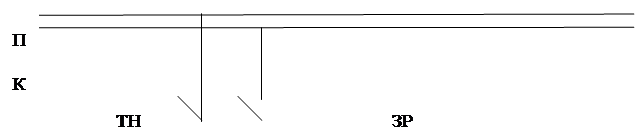 Рис. Электрическая схема автотрансформаторного пункта: П – питающий провод, К – контактная сеть, ОД – отделитель, ЗР - заземляющий разъединитель, КЗ – короткозамыкатель, АТ – автотрансформатор, ТР – тяговый рельс