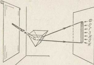 Дисперсия света. В яркий солнечный день закроем окно в комнате плотной шторой, в которой сделаем маленькое отверстие. Через это отверстие будет проникать в комнату узкий солнечный луч, образующий на противоположной стене светлое пятно. Если на пути луча поставить стеклянную призму, то пятно на стене превратится в разноцветную полоску, в которой будут представлены все цвета радуги—от фиолетового до красного (рис. 2: Ф – фиолетовый, С — синий, Г — голубой, 3 — зеленый, Ж —желтый, О —оранжевый, К — красный).