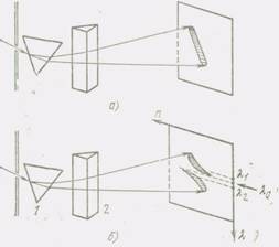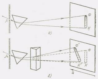 Опыт 1. Прохождение света через скрещенные призмы. Перед отверстием А, пропускающим в затемненную комнату узкий пучок солнечных лучей, помещают призму с горизонтально ориентированным преломляющим ребром (рис. 3,а).