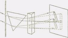 На рис. 4 представлен еще один вариант опыта со скрещенными призмами: через призмы проходят два одинаковых световых пучка. Оба пучка формируют на экране одинаковые полоски спектра, несмотря на то, что в первой призме лучи одного и того же цвета (но из разных пучков) проходят пути разной длины.