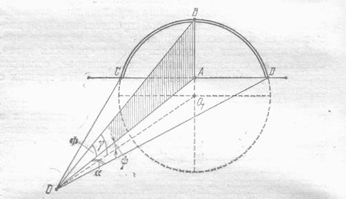 На рис. 10 эта прямая обозначена как прямая OO1 ; O — наблюдатель, ОСD — плоскость земной поверхности, ÐAOO1 = j — угловая высота Солнца над горизонтом. Чтобы найти tg(j), достаточно разделить рост наблюдателя на длину отбрасываемой им тени. Точка O1 называется противосолнечной точкой, она находится ниже линии горизонта СD. Из рисунка видно, что радуга представляет собой окружность основания конуса, ось которого есть ОO1 ; j - угол, составляемый осью конуса с любой из его образующих (угол раствора конуса). Разумеется, наблюдатель видит не всю указанную окружность, а только ту часть ее (на рисунке участок СВD), которая находится над линией горизонта. Заметим, что ÐАОВ = Ф есть угол, под которым наблюдатель видит вершину радуги, а ÐАОD = a — угол, под которым наблюдатель видит каждое из оснований радуги (где, по английскому поверью, закопан горшок с золотом). Очевидно, что