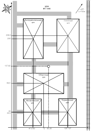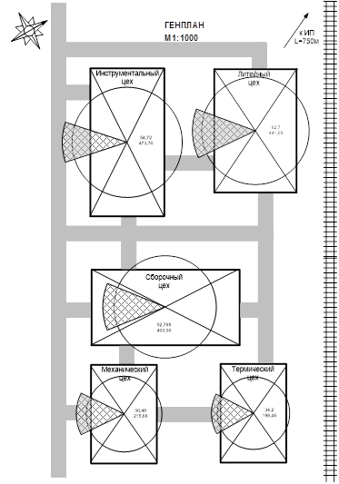 В курсовом проекте рассчитаны электрические нагрузки цехов, определен центр электрических нагрузок (рис.5). Выбрано место положения главной распределительной подстанции (рис.6). Рассчитаны мощности цехов с учетом потерь в трансформаторах и с учетом компенсации реактивной мощности на низкой стороне. Выбраны кабели. Рассмотрены два варианта схем электроснабжения радиальная и магистральная схемы, по стоимости схем выбрана магистральная схема электроснабжения. Рассчитаны ток короткого замыкания для РУ-10 кВ, выбрано и проверено оборудование для магистральной схемы.