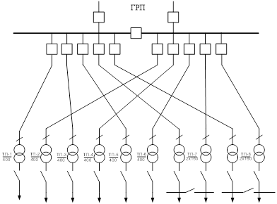 В курсовом проекте рассчитаны электрические нагрузки цехов, определен центр электрических нагрузок. Выбрано место положения главной распределительной подстанции. Рассчитаны мощности цехов с учетом потерь в трансформаторах и с учетом компенсации реактивной мощности на низкой стороне. Для сети 10кВ выбраны кабельные линии. Рассмотрены два варианта схем электроснабжения – магистральная и радиальная схемы. Рассчитаны ток короткого замыкания для РУ-10 кВ, выбрано и проверено оборудование для схемы электроснабжения. Нарисована однолинейная схема электроснабжения.