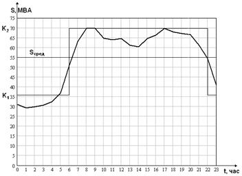 Средняя нагрузка характерных зимних суток подстанции Sсред = 54,9 МВА. Выделим продолжительность ступени перегрузки К2 = 69,8 МВА, а К1 как среднеквадратичное значение оставшейся нагрузки. Оно равно К1 = 35,9 МВА.