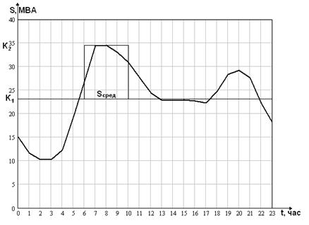 Средняя нагрузка характерных зимних суток подстанции Sсред = 23,1 МВА. Выделим продолжительность ступени перегрузки К2 = 34,5 МВА, а К1 как среднеквадратичное значение оставшейся нагрузки. Оно равно К1 = 23,1 МВА.