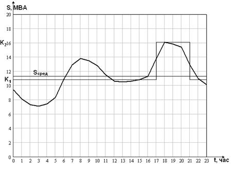 Средняя нагрузка характерных зимних суток подстанции Sсред = 11,3 МВА. Выделим продолжительность ступени перегрузки К2 = 16,1 МВА, а К1 как среднеквадратичное значение оставшейся нагрузки. Оно равно К1 = 10,8 МВА.