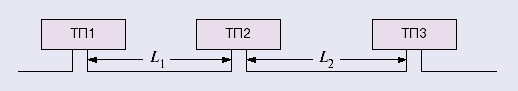 Расчет надежности СТЭЛ можно рассмотреть на примере участка с двумя межподстанционными зонами (L1 = 57 км, L2 = 50 км) и тремя тяговыми подстанциями (рис. 1).