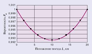 Рис. 2. Зависимость вероятности надежного электроснабжения Рк (до токоприемника) от положения поезда
