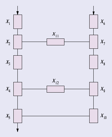 На рис. 4 элементы Х1 и Х6 соответствуют вводам подстанции 110 кВ; Х2, Х7 — шинам подстанции 110 кВ; Х3, Х8 — трансформаторным цепям; Х4, Х9 — шинам 27 кВ; Х5, Х10 — фидерам с основным и запасным выключателями; Х11, Х12 — выключателям 110 и 27,5 кВ.