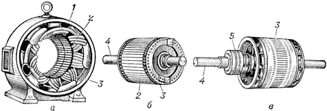 Например, двигатели с воздушным и водяным охлаждением (общего применения); герметичные, маслонаполненные (для электробуров) и взрывобезопасные (для работы в шахтах, взрывоопасных помещениях и др.); пыле-, брызгозащищённые (для применения в морских условиях и тропическом климате) и т. д. Некоторые виды А. э. (например, шаговые, для следящих систем, схем автоматики и телемеханики, со ступенчатой регулировкой скорости и пр.) разрабатываются и выпускаются комплектно с блоками управления и пускозащитной аппаратурой, с встроенными редукторами. Трёхфазные А. э. сравнительно с однофазными обладают лучшими пусковыми и рабочими характеристиками. Основные конструктивные элементы А. э.: статор — неподвижная часть (рис.1 а) и ротор — вращающаяся часть (рис.1 б, в). В соответствии со способом выполнения роторной обмотки А. э. делятся на двигатели с контактными кольцами и короткозамкнутые. Воздушный зазор между статором и ротором у А. э. делается по возможности малым (до 0,25 мм). Частота вращения ротора А. э. зависит от частоты вращения магнитного поля статора и определяется частотой питающего тока и числом пар полюсов двигателя.