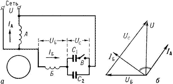 Рис 2. Схема (а) и векторная диаграмма (б) конденсаторного асинхронного двигателя: U, UБ, UC — напряжения; IA, IБ — токи; А и Б — обмотки статора; В — центробежный выключатель для отключения С1 после разгона двигателя; C1 и C2 — конденсаторы.