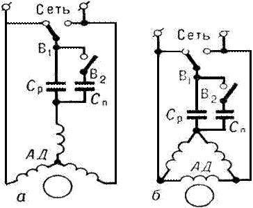 Рис 3. Схема включения в однофазную сеть трёхфазного асинхронного двигателя с обмотками статора, соединёнными по схеме «звезда» (а) или «треугольник» (б): B1 Переключатель направления вращения (реверс), В2 — Выключатель пусковой ёмкости; Ср — рабочий конденсатор; Cп — пусковой конденсатор; АД — асинхронный электродвигатель.