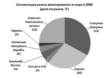 По итогам 2009 крупнейшими географическими регионами по объемам пассажирских авиаперевозок являются: - Северная Америка: 33%; - Европа: 28%; - Азиатско-Тихоокеанский регион: 22%. Доля России в мировом объеме пассажирских авиаперевозок составляет 2,4% (122,5 млрд. пасс. км), при этом на долю РФ приходится около 83% от общего объема авиаперевозок авиакомпаниями стран СНГ.