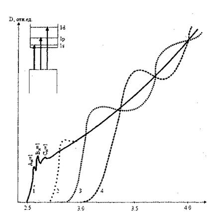 Рис.1.3. Зависимость спектра поглощения микрокристалла CdS от размера: (1) -320 Ǻ ; (2) - 23 Ǻ ; (3) – 15 Ǻ; (4) – 12 Ǻ [6].