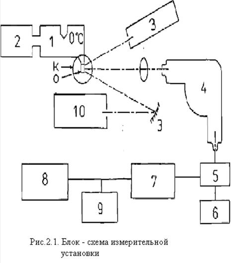 Исследования фотолюминесценции (ФЛ) нанокристаллов сульфида кадмия, диспергированных в полимере в области длин волн 0,45 - 1,0 мкм производили на измерительной установке, блок-схема которой изображена на рис.2.1. Люминесцирующие образцы (О) охлаждались в стеклянной камере (К), в которую заливался жидкий азот. Ее основой был медный блок, снабженный снизу нагревателем из нихромовой проволоки, а сверху металлическим сосудом Дьюара, в который заливался жидкий азот. Температура кристалла, закрепленного на медном блоке, могла быть установлена в пределах от 77 до 450 К. Термический контакт образца с блоком осуществлялся посредством пасты из окиси бериллия. В измерительной камере создавался вакуум порядка 10-5 мм рт. ст. Температура образца измерялась с помощью дифференциальной медь константановой термопары (I), ЭДС которой регистрировалась вольтметром В7-21 (2). Возбуждение люминесценции образцов осуществлялось излучением гелий кадмиевого лазера ЛГМ-517 с длиной волны 441,6 нм (3). Интенсивность возбуждающего света регулировалась нейтральными светофильтрами. Люминесцентное излучение образцов, прошедшее через монохроматор УМ-2 (4), регистрировалось фотоэлектронным умножителем ФЭУ-62 или ФЭУ-106 (5). Питание ФЭУ осуществлялось стабилизированным напряжением (6).Сигнал с анода фотоумножителя подавался на усилитель постоянного тока ИМТ-05 (7), затем либо на вход двухкоординатного самопишущего потенциометра Н-306 (8), либо на цифровой вольтметр В7-21 (9).