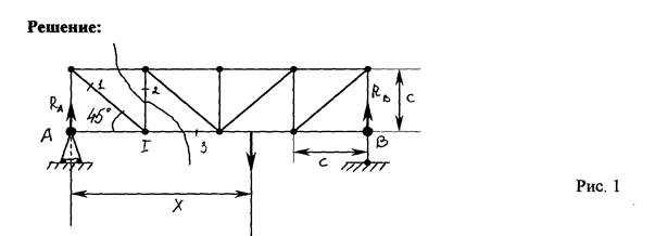 Активные силы и реакции опор являются внешними силами для всей фермы, рассматриваемой как твердое тело; усилия в стержнях в этом случае - внутренние силы. Поэтому для определения усилий необходимо рассмотреть равновесие части фермы, для которой искомые усилия являются внешними силами.