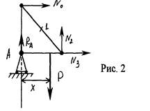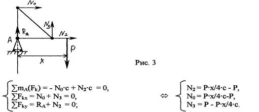 Проведем сечение конструкции так, как указано на рис.1, и рассмотрим равновесие левой части фермы (рис.2), заменяя действие на нее правой части силами, направленными вдоль стержней (соответственно N0 , N2 , N3 ) . Составим условия равновесия, учитывая, что нагрузка движется слева направо, а "х" есть изменение расстояние от опоры до узла, в котором приложена сила. Найдем усилия в стержнях для случая, когда 0<=х=>с