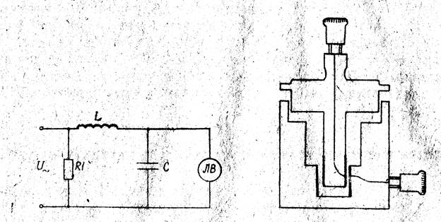 Катушка индуктивности при помощи лапок крепится к клеммам измерительного конденсатора. В цепь колебательного контура подключается высокочастотный конденсатор Г синусоидального напряжения и ламповый вольтметр ЛВ, который служит для измерения напряжения на конденсаторе.