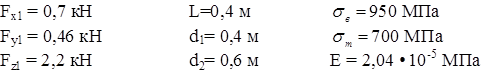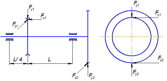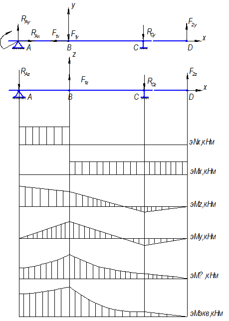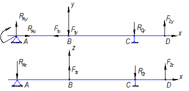 Для заданной схемы вала определяем из условия равновесия недостающие внешние факторы и приводим их к оси вала, разложив на составляющие в плоскостях XY и XZ