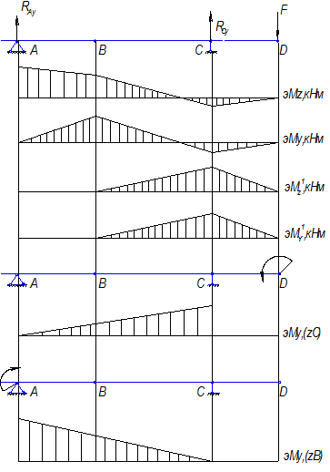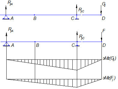 Чтобы определить прогиб, строим единичную систему и эпюры моментов от единичной силы, для этого приложим в точке С силу F=1H.
