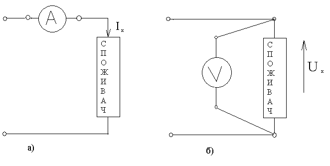 Рис. 1.1.1 Схеми вимірювання постійногоструму і напруги.