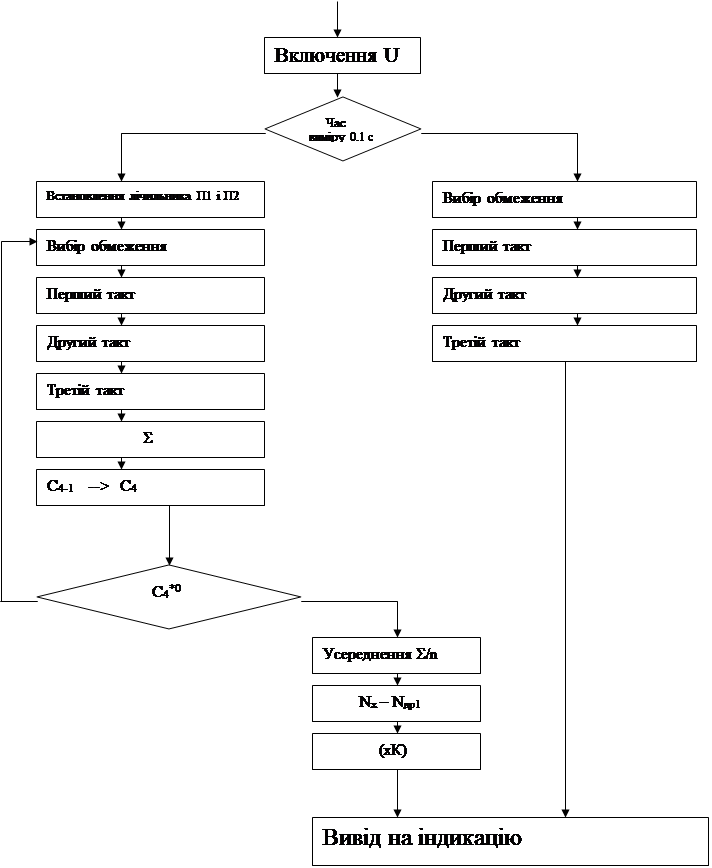 Спрощена структурна схема програми вимірювання показана на рис.1.2.2 . Обчислення Nx – Nдр відповідає проведенню корекції адитивної похибки. Ця операція проводиться в будь-якому режимі вимірювання. При роботі приладу в три такти вимірювання (n1=1) або при роботі з усередненням (n2 = 10...100) , коли необхідно забезпечити відповідно 6.5 і 7.5 десяткових розрядів , передбачена корекція мультиплікативної похибки – операція (ХК).
