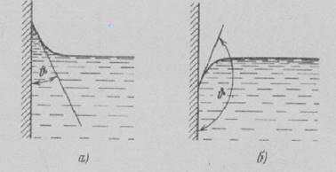 Искривлённая поверхность жидкости в узких цилиндрических трубках или около стенок сосуда называется мениском. Поверхность смачивающей жидкости вблизи твердого тела поднимается, а мениск – вогнутый (рис.1.3,а). У несмачивающей жидкости ее поверхность вблизи твердого тела несколько опускается, и мениск – выпуклый (рис.1.3,б).