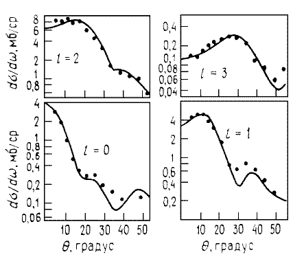 Ni при энергии Ed = 15 МэВ, и результаты расчетов по методу искаженных волн. Все четыре случая различаются передачей орбитального момента l