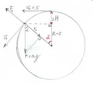 Е1 -Е0 =∆H∙m∙g ↔ mv1 2 /2-mv0 2 /2 = (R-R cos α )mg ↔ v1 2 -v0 2 =2g(R-R cos α )