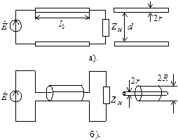 Рис. 1.1 Двухпроводная (а) и коаксиальная (б) линии передачи.