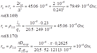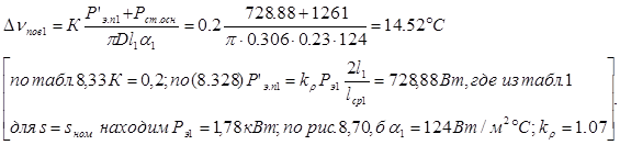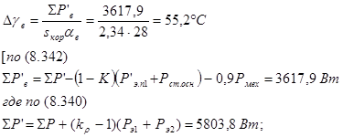 Р=5592 Вт из табл. 1 для s=sном; по (8.343) sкор=(πDa+8Пр)(l1+2lвыл1)=2,34 мІ, где по рис. 8.73 Пр=0,45 м для h=250 мм; по рис. 8.70, б αв=28 Вт/мІ°С для Da=0,45 м].