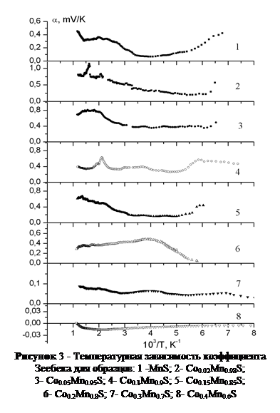 Уменьшение величины коэффициента термо-ЭДС α с увеличением содержания кобальта в решетке α-MnS указывает на то, что кобальт действует как донорная примесь, поскольку величина термо-ЭДС определяется суммарным эффектом двух типов носителей заряда, которые нейтрализуют друг друга. В твердом растворе Co0.4 Mn0.6 S число носителей, создаваемых кобальтом, становится преобладающим, в результате величина и знак термо-ЭДС обусловлены исключительно катионами кобальта. Возникновение донорной примеси в α-MnS при замещении марганца кобальтом, очевидно, связано с преобладанием в ионе кобальта двух электронов на d-оболочке по сравнению с числом электронов на d-оболочке в ионе марганца.