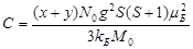 где N0 – число Авогадро; M0 – молекулярный вес; (x+y) – содержание магнитных ионов Mn и Fe; μБ – магнетон Бора; S=5/2 – спин и g=2 (g – фактор магнитных атомов Mn, содержание которых - «х»), S=2 для атомов Fe (содержание которых - «у» в кристаллах) брали в соотношении, соответствующем составу загружаемой в ампулу шихты («х» и «у»), причём результирующий спин находится в пределах (2 < S < 2,5) в зависимости от соотношения «х» и «у».